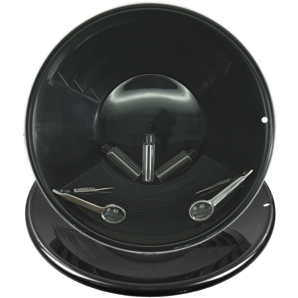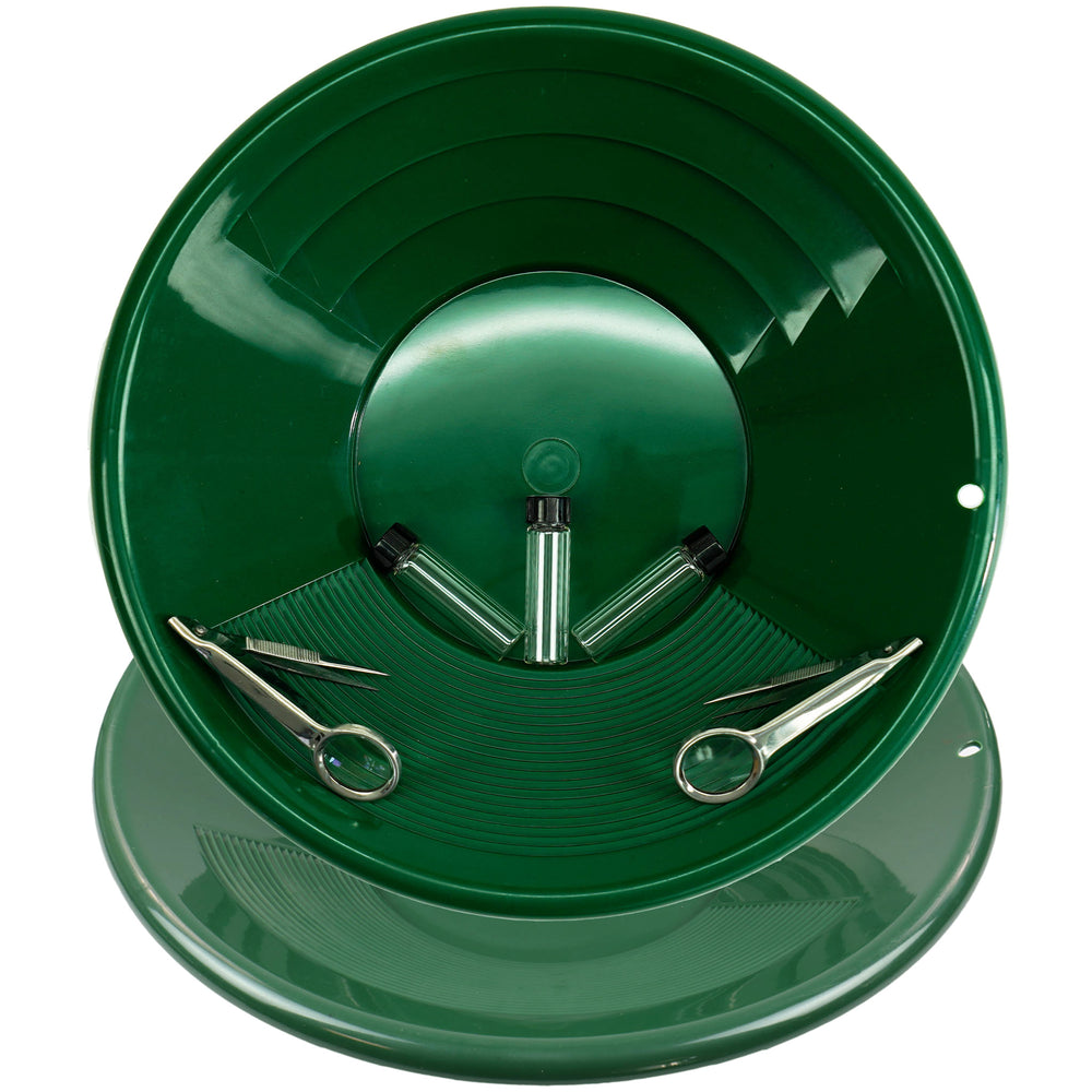 Terrax 7 pc Prospecting Kit. This kit includes essential tools for prospecting including two 12" prospecting pans, three glass vials, and two folding magnifier tweezers. Get ready to discover gold and precious minerals with ease and precision.