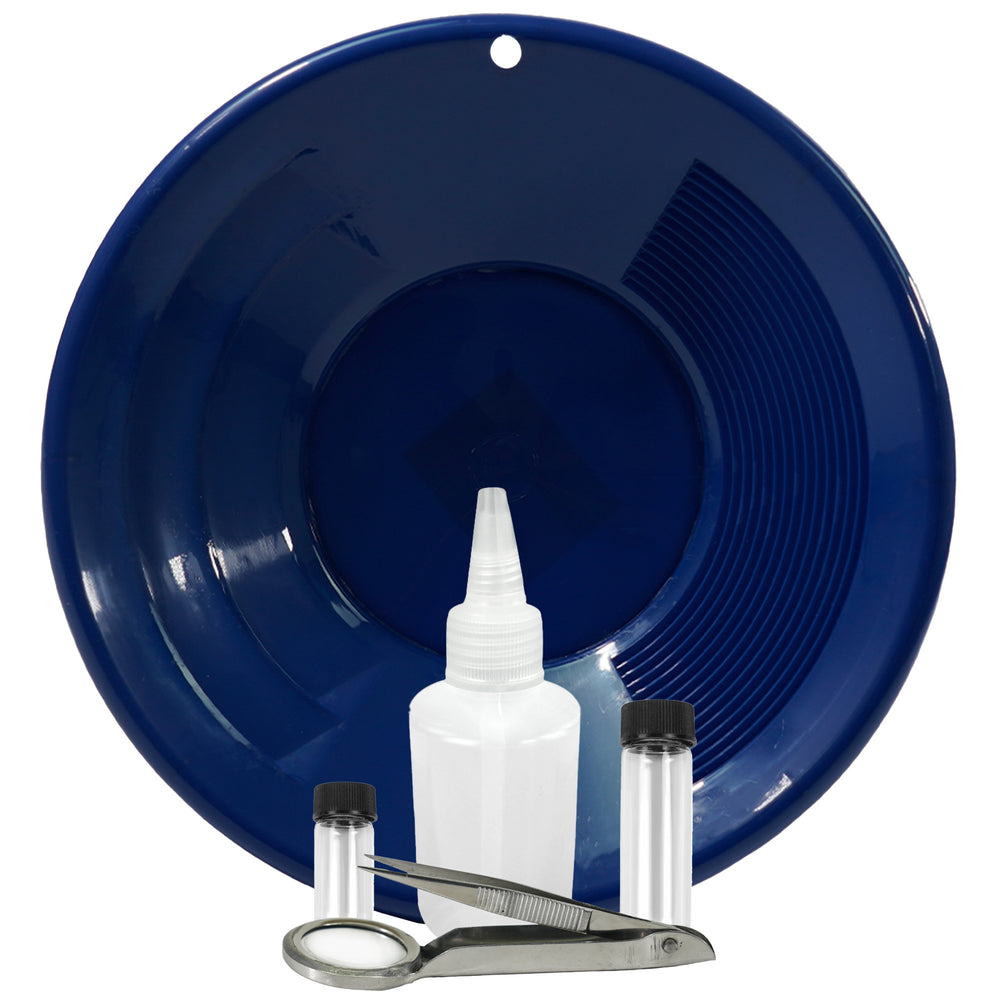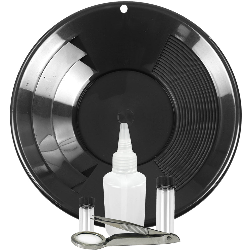 Terrax 5 pc Prospecting Kit. This kit includes essential tools for prospecting including a 10" prospecting pan, two glass vials, folding magnifier tweezers, and a snifter bottle. Get ready to discover gold and precious minerals with ease and precision.