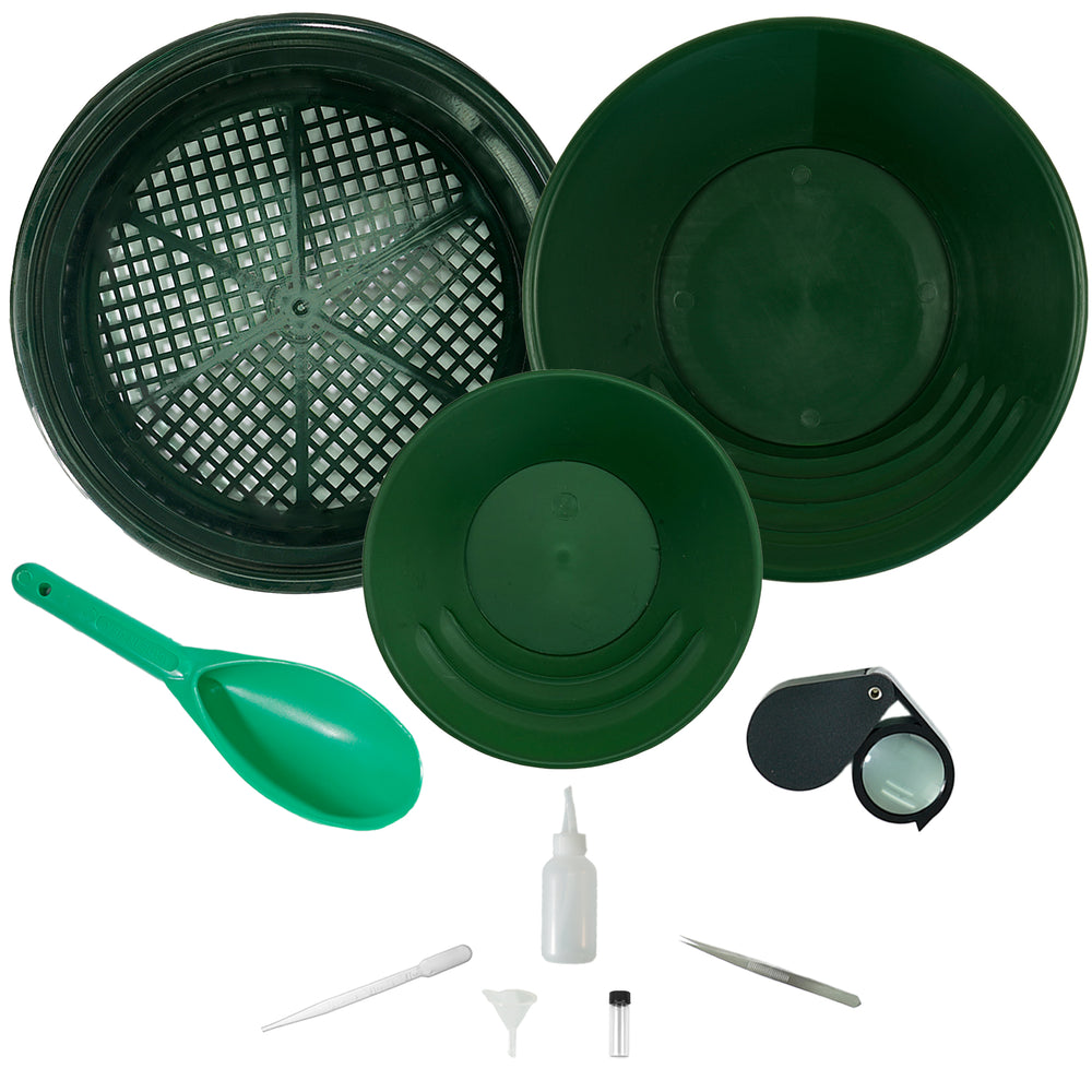 Everything you need to get started for fun and profit! Our Complete Gold Panning Kit includes all the essentials for an exciting gold prospecting adventure. This kit comes with a 10" plastic gold pan, a 14" plastic gold pan, and a 13 1/4" plastic classifier with 5/16 holes. It also includes a treasure scoop, fine point stainless steel tweezers, a snuffer bottle, a mini transfer funnel, a clear glass gold vial with lid, and a handy folding magnifier. Additionally, you’ll receive a pamphlet on how to pan for gold. Made from durable plastic material and available in black or green, this kit is proudly made in the USA. Start your gold panning journey today with this complete, high-quality kit!